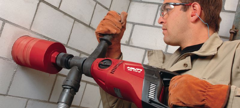 - Sistema de módulo Hilti X-Change exclusivo (de 52 mm hasta 202 mm de diámetro) que permite retirar de manera sencilla la corona, solucionar rápidamente los problemas de atascos de brocas y reafilar las brocas en el lugar de trabajo solo con un destornillador de punta plana