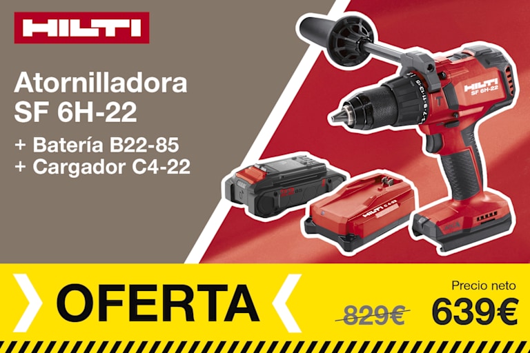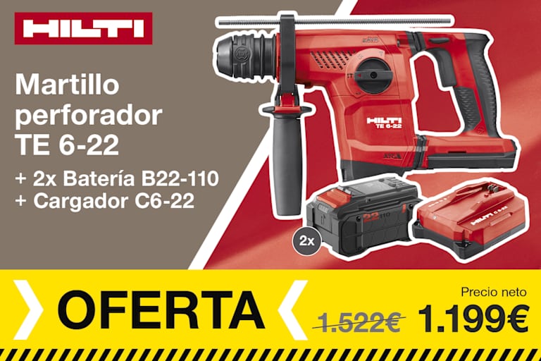 Kit básico compuesto por: Martillo perfor. a batería TE 2-22 + Atorn. tabique seco a batería SD 5000-22 + Cargador C 4-22 + 2 Baterías B 22-55 + Broca TE-CX 6/12 + Broca TE-CX 5/12 + Punta S-B PH2 + Adaptador para punta S-BH + Tope de profundidad.