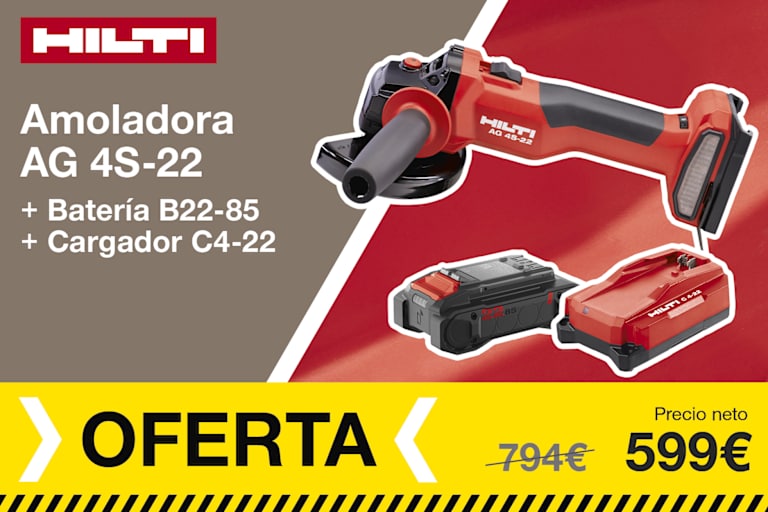 Kit básico compuesto por: Martillo perfor. a batería TE 4-22 + Amoladora angular a batería AG 4S-22-125 + Empuñadura lateral + Cubiertas de protección + Cargador C 6-22 + 2 Baterías B 22-85 + Broca TE-CX 8/12 + Broca TE-CX 10/17.